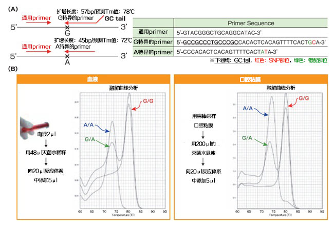 (A) 表示ALDH2 SNP检测用引物。为了能在一管中进行基因型的分辨,引物设计时,在一条等位基因特异的引物上加了GC tail (下划线部分),使扩增产物的融解温度(Tm值)产生差异。GC tail的添加使得融解温度大幅度上升,使用扩增长度在100bp以下。另外,该实验例中,将等位基因特异的引物3’端开始第2位碱基设为SNP位点(红色)、第3位碱基设计了错配(绿色)位点。