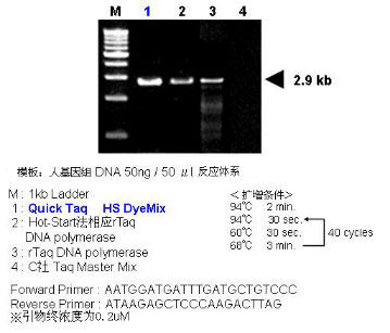 以人基因组DNA(50ng)为模板,以较难扩增的人p53基因(2.9kb)为目的片段进行扩增。结果可见,使用Quick Taq HS Dye Mix可得到最高效率和最高特异性。另外,可知在不采用热启动法的情况下(3、4泳道),特异性及灵敏度都很低(Quick Taq HS Dye Mix采用热启动法)。