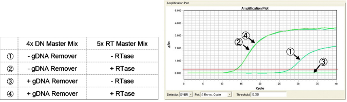 条件:使用gDNA Remover添加(+)、或无添加(-)的4x DN Master Mix,进行gDNA去除反应之后,分别用5x RT Master Mix II或5x RT Master Mix II no-RT Control进行逆转录反应。