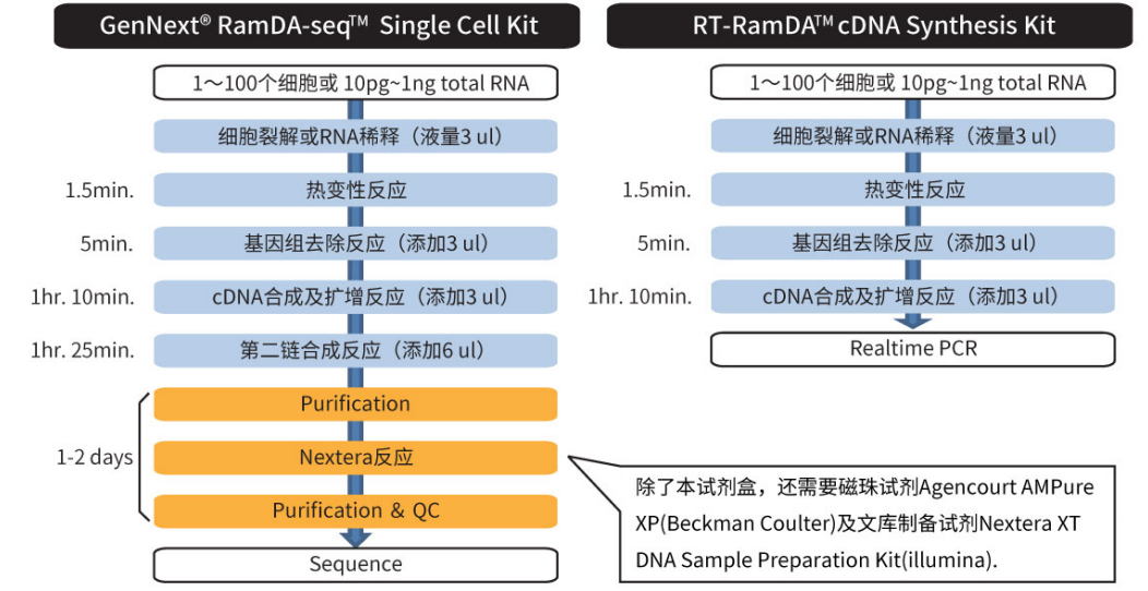 GenNextⓇ RamDA-seqTM Single Cell Kit (RMD-101, RMD-101T) 是可使用单细胞和微量RNA制备出NGS分析用cDNA的试剂盒。使用本试剂盒,可以获得全长total RNA-seq用的cDNA。(用于文库制备,除本产品外,还需要磁珠Agencourt AMPure XP试剂 (Beckman Coulter) 以及文库制备试剂Nextera XT DNA Sample Preparation Kit (illumina))。