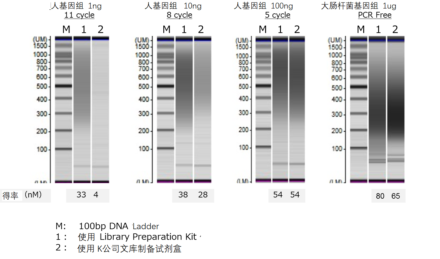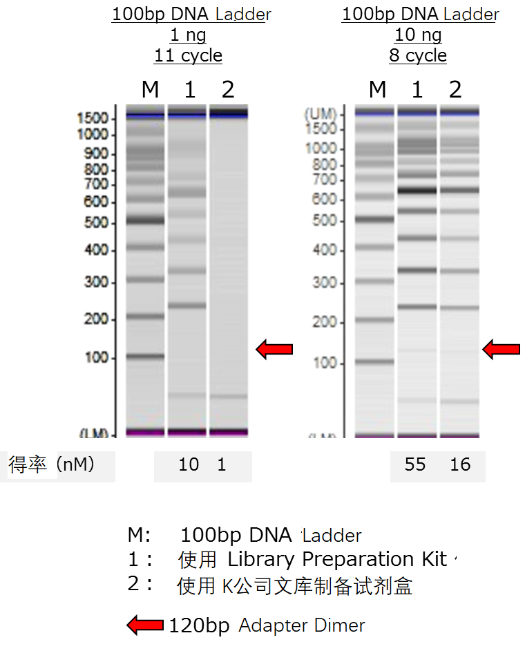 以片段化处理过的人基因组DNA 1、10、100ng、大肠杆菌基因组DNA 1ug、以及100bp DNA Ladder 1、10ng开始,使用GenNext® NGS Library Prep Kit或A公司文库制备试剂盒进行文库的制备。