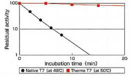 相对于野生型T7 RNA Polymerase,提高了耐热性,在高达50℃下仍可进行反应、且在37℃下的比活性也有了提高。