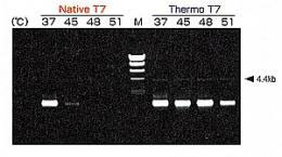 使用野生型 T7 RNA Polymerase与Thermo T7 RNA Polymerase ,比较了各温度下in vitro 转录的活性。 结果显示,Thermo T7 RNA Polymerase 在51℃条件下,仍可进行转录反应。 | ![]() |
