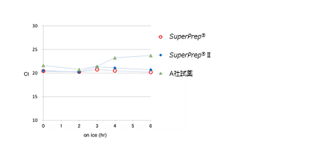 使用SuperPrep® II Cell Lysis & RT Kit for qPCR (Code No. SCQ-401),将4x104 个HeLa S3 细胞制备成细胞裂解液,转移到冰上,0 ~ 6小时后,取样细胞裂解液,立即进行cDNA 的合成。同样方法,本公司原来的产品(SuperPrep®) 及A公司的试剂制备细胞裂解液,同样时间点取样,进行cDNA合成。以该cDNA为模板,使用THUNDERBIRD® Probe qPCR Mix (Code No. QPS-101) 进行荧光定量PCR对GAPDH基因的表达进行分析。