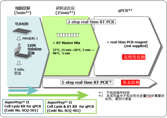 SuperPrep®ⅡCell Lysis Kit for qPCR [Code No. SCQ-501]是单独销售的细胞裂解试剂(Lysis Reagents)。可以使用本公司的RNA-direct™ Realtime PCR Master Mix (Code No. QRT-101, QRT-201) ,THUNDERBIRD® Probe One-step qRT-PCR Kit (Code No. QRZ-101) 等1-step法Realtime PCR试剂进行分析(简易测定)。