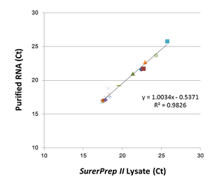 结果显示,这次分析的15种基因, 纯化RNA与使用细胞裂解物分析得到的结果具有良好的相关性。