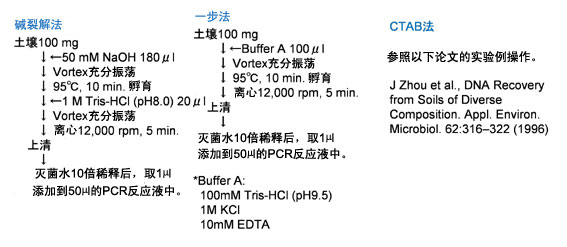 用各种方法从混合肥料(堆肥)中抽提出粗DNA溶液,以该DNA溶液处理后的上清为样品,用原核生物共同的引物进行rDNA扩增。结果可见,用碱裂解法和一步法配制的样品,与常见的CTAB法得到的样品,可得到同等的扩增效果(下图)。
