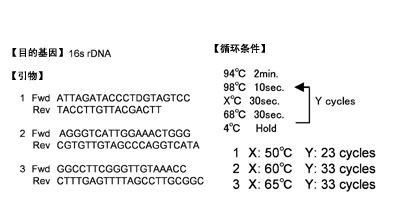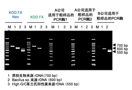 此外,使用碱裂解法得到的上清、各种扩增试剂、3种通用引物进行rDNA扩增,结果可见,用KOD FX Neo可得到最好的结果(下图)。