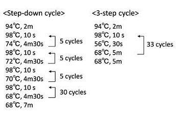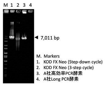 使用KOD FX Neo时,虽然用一般的PCR条件(3-step cycle)就可能检测出来,但是如果用step-down的PCR条件, 则可能更加明确的检测出来。而使用A公司的高效率PCR酶时,虽然这次检测到了,但是之前有时检测的到,有时检测不到。感觉这种情况跟DNA的量及酶量有关。A公司高效率PCR酶的用量需要增加到推荐用量的2.5倍左右才有可能检测到。A公司的Long PCR酶完全检测不出来。