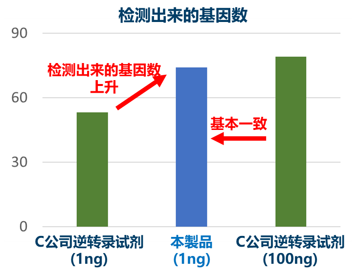 结果显示,与C公司相比,在1 ng的添加量下,本产品可以检测到更多的基因,与C公司投入100倍RNA量的情况下检测到的基因数接近。