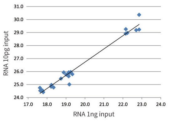 分别使用10pg和1ng NIH3T3 Total RNA ,用RT-RamDATM cDNA Synthesis Kit制备cDNA, 通过qPCR比较8个基因(N=3)的Ct值。结果显示, 10pg的输入量和1ng 的输入量具有高度相关性、微量的输入量也可制备cDNA。