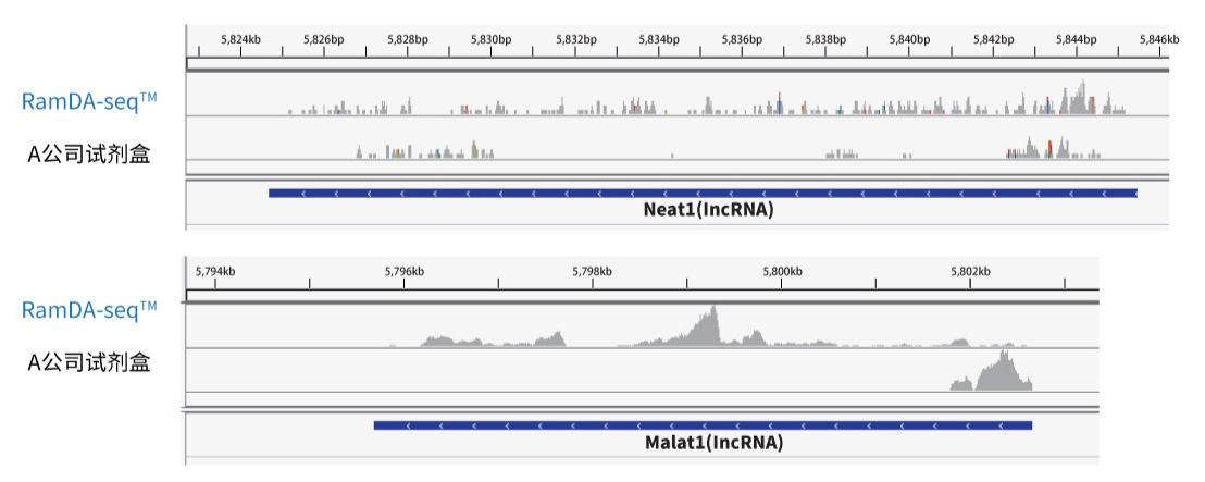 以10pg mES total RNA开始,使用GenNext® RamDA-seqTM Single Cell Kit及A公司的试剂盒制备cDNA、双链DNA,进行NGS分析。NGS分析使用illumina MiSeq仪器。结果显示:使用GenNext® RamDA-seqTM Single Cell Kit可以检测到用A公司的试剂盒检测困难的Neat1及Malat1这样的lncRNA或在全长范围内进行检测。