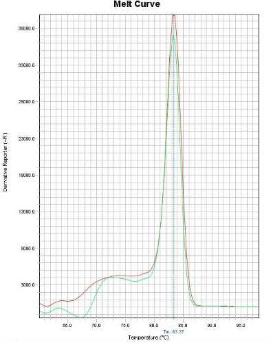 菌液的融解曲线的形状与提纯的DNA大致相同。峰也显示出相同的Tm,非特异性产物也基本没有产生。