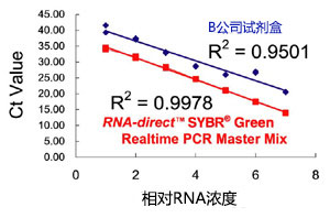 结果显示,与Taq+RTase混合型的B公司试剂盒相比,RNA-directTM SYBR® Green Realtime PCR Master Mix的反应中,至少可以在7个梯度的稀释系列中表示出高度相关性。