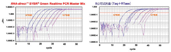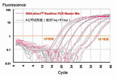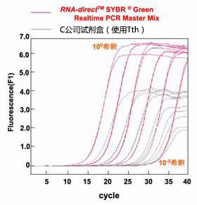结果显示,与同样使用Tth DNA Polymerase的C公司试剂相比,RNA-directTM SYBR® Green Realtime PCR Master Mix的检测中,起峰早、信号强以及检测灵敏度都得到了极大提高。