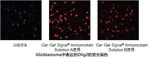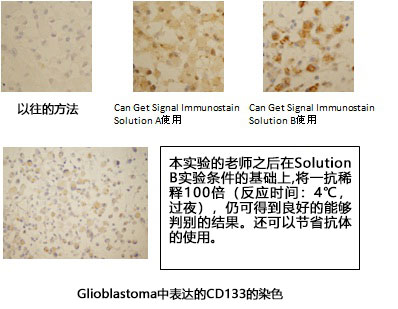 结果可见,用以往方法信号很微弱,而用Can Get Signal® immunostain信号可得到增强。特别是用Solution A的情况下,染色非常明亮,且抑制了背景。