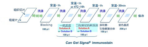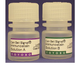 | 作为免疫组织染色的抗体反应液(稀释液)使用,具有改善实验灵敏度及特异性的功能。Can Get Signal® immunostain是在深受好评的Western Blot、ELISA用Can Get Signal® 的基础上改良的免疫染色专用抗体反应缓冲液。本试剂备有反应促进效果不同的Solution A和B,初次使用时,可用Starter Set进行测评。Solution A和B都可用于一抗及二抗(标记抗体)的反应,和分别对应于1抗和2抗的Can Get Signal® 的Solution 1和2不同。 | ![]() |