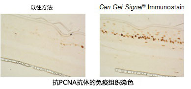 用通过人皮肤组织模型TESTSKINTM制备的石蜡包埋切片作为抗原,分别使用抗PCNA鼠的单克隆抗体作为1抗,2抗的生物素标识抗鼠IgG抗体、通过免疫组织化学染色对PCNA进行检测(ABC法)。分别用Can Get Signal® immunostain(使用Solution A)和含1.5%马正常血清的PBS (以往方法)对抗体的反应进行染色效率的比较。结果可见,与以往方法相比,使用Can Get Signal® immunostain可得到高信号、低背景、明亮的染色图像。